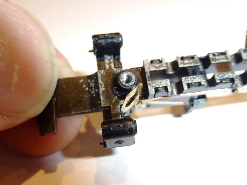 Here, the 2-6-0 chassis showing the plastic top-hat insulation washer in place with the conductive brass washer bent out of the way. The washer provides conductivity for the right hand bogey wheel pickup. The top hat washer stops it from earthing agaisnt the chassis. |