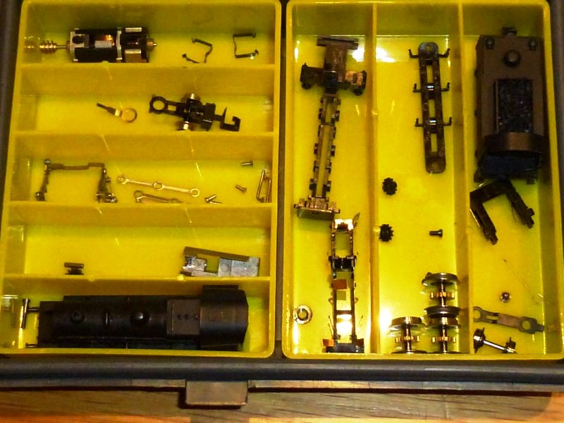 The Ivatt 2-6-0 in bits placed in a handy little tray with lid that I located. The tender is still in one piece -apart from the front axle which I needed to remove in order to get to the screw to remove the coupling. Left tray top to bottom: Motor and clips; front bogey; valve gear and con rods; Boiler weght, drive gear and axle; Loco Body Right tray left to right: Chassis, plastic contact holder and insulating top-hat washer; baseplate, screws, intermediate gears and axles; Tender, motor clip, spring conductor, coupling, front tender axle. |