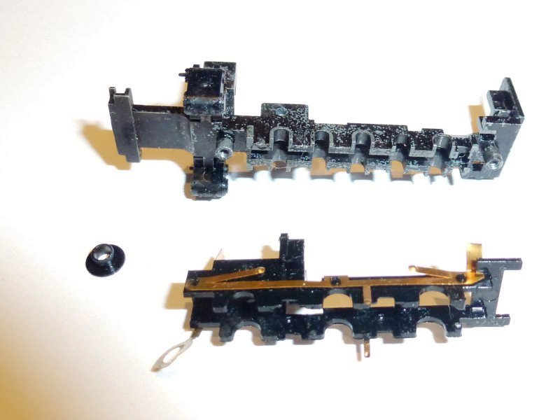 .... The lugs behind the rear wheel axle slot are captive, and need to be gently prised outwards, away from the chassis, both at the same time, while gently pressing the plastic down towards the table. (If the chassis was the correct way up, we would be lifting the rear of the plastic upwards from the chassis.) The front of the chassis slots in under the metal lampholder upright. Be careful of the brass washer that you bent out of the way, and the whole assembly lifts out. |
