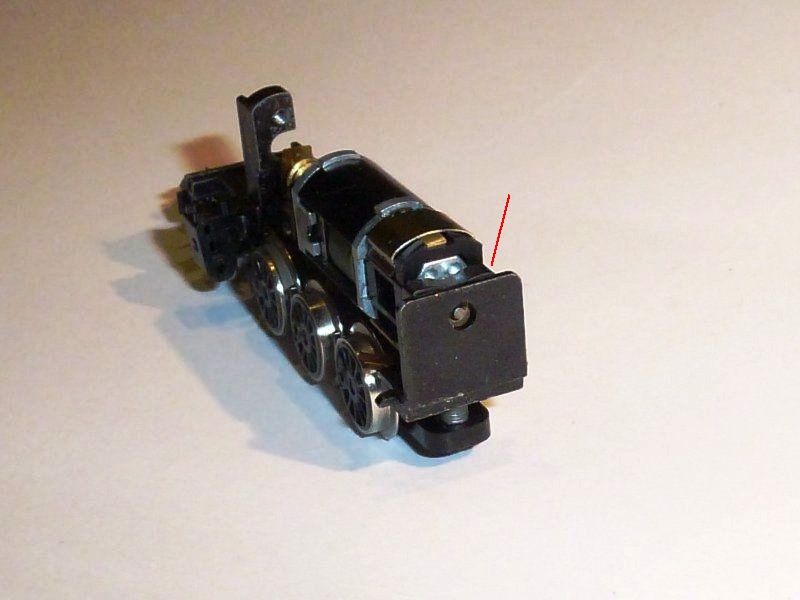 The rear motor clip can be spotted between the motor and the end casting. When removing, the clip has to be released from the bottom on each side. The chassis provides a leverage slot for a small screwdriver to ease it from its recess. Release one side, just enough and then the other. When both sides are free, the clip can be lifted out fromt he top. If the clip skews, don't force it - being spring steel, it will break. |