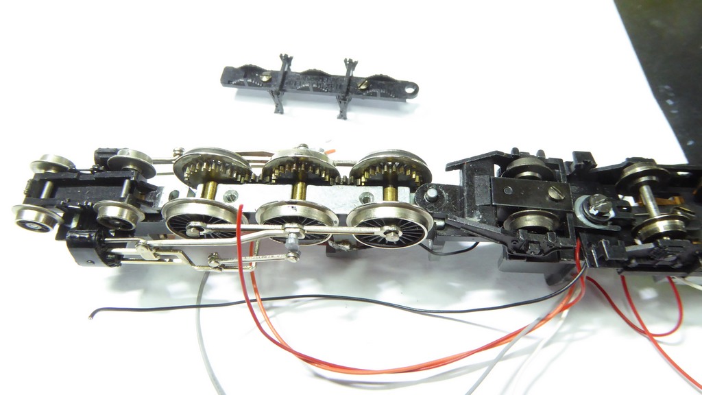 Gently drop the baseplate into position. The hole in the rear end is easy to align. You may need to manoeuvre the fron bogie to get the peg to drop into the elongated hole in the front bogie. Do not at any time use even the slightest force. If it doesn't drop intoplace by gravity alone, something is wrong.