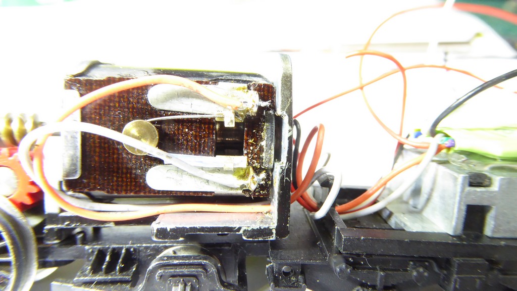 The orange and grey wires can be soldered to the motor. Beware the protruding ends do not touch the chassis. Also beware the insulating sleeve on one arm of the spring (the lower arm in the photo). Keep the soldering iron on the contact for too long and the sleeve could melt. In fact the sheet on the motor as it faces you does not like to get too hot. If you don't get the joint soldered quickly first time, let it cool down and try again later. |