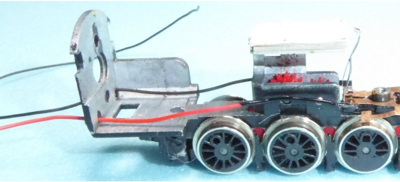 Solder the red and black leads to the tabs on each phosphor bronze strip. Cut the leads for the tender to length, leaving a small loop between loco body and tender. Note that I have already painted the red lead black where it is likely to be visible when the boiler is fitted. |