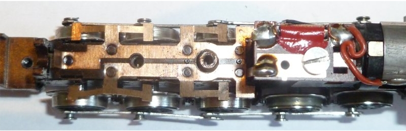 9F Overhead View of Chassis and Contact Strip Note the contact points for each wheel, and the extra contact at the front of the loco for the positive end of the light bulb. This picture also shows the red lead from the choke coil connected to the top brush of the motor. If the motor is replaced upside down, this wire will be at the bottom, and the engine will run backwards when it should be moving forwards ! The cheese-head screw next to the red wax which coats the choke coil, provides the main connection between the left hand copper strip (negative) and the chassis. On some locos, (like this one), this is the only secure connection to the chassis. |