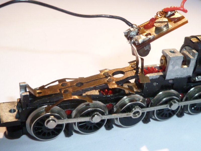Removing the Copper Strip Here is the copper strip being lifted out. The black wire is the positive connection for the right wheel pickups in the tender. The loco should run quite happily without this, although it may stutter over points without the extra pickups provided in the tender. |