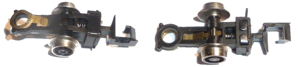 The Top and Bottom View of the Front Bogie. The front bogie has an insulated right hand wheel and electrical pickup is carried from the left hand negative rail, via the left wheel to the chassis from the axle. The tiny connection ring and spar which can be seen on the left hand bogie in the photo is an important part which can be lost easily. The photo shows how this is fitted. The ring will make contact with the chassis. These bogies are actually from a 2MT, but they are identical to the ones for the 2-6-0 and 2-6-2 varieties of 2MT as well as the Black 9F and Evening Star. |