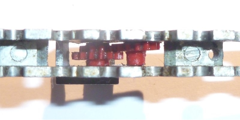 A shot taken from underneath the chassis before the cogs were firmly located on pins or axles. Front is to the right of the photo. The right side of the loco is at the top of the photo. Use long nosed pliers to hold the axle by one end, and place it in the hole just enough to hold it in position. With a light, look at the cog though the axle hole from the other side. Use the pin to make sure that they are aligned, and then firmly push the axle though. |