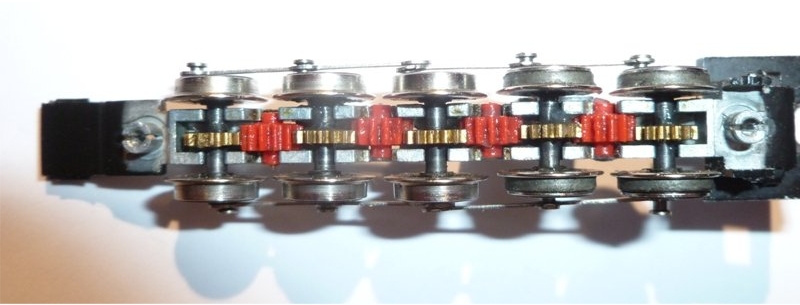 Inserting the wheels and gears looks easy, but is quite tricky. Place all 4 gears into their (deeper) slots. Start with the rear set of wheels (they have tyres). Remove the connecting rod from one side only - prise the pins out by twisting a screwdriver between the wheel and the coupling rod. (see photos in the Dismantle section of the Mallard). Drop the first axle into place (check the spare end is facing the middle axle position), and rotate the wheel so that the crankpin hole is at the 12 o'clcok position. Easy. Now drop the 2nd axle in. Then spend a bit of time ensuring that the hole is at 12 o'clock. As you do so, note that as you rotate the wheel, the plastic cog will rise out of its slot, and the axles will rise out of theirs. When you think you have them both correct, push the downwards on the gears to make sure that they are seated, and check the positions again. Now with two wheels and one red cog to keep in place, repeat the operation for the middle axle. V Then with 3 axles and 4 cogs to hold, drop in the other pair of wheels (Again easier if you remove the coupling rod from one side (the same side as before!). Each time, ensure that the wheel is in its proper position before moving to the next wheel. You have to do them in sequence - rear to front or front to rear. Note that there is a little play in each axle/cog. Make sure that all of the slack is taken up in (say) the clockwise direction, before checking the alignment. And keep checking that the axles and cogs are pushed down fully into their slots. You may wish to place the bottom plate in position after fitting 3 axles so that you can be sure that the rear 3 are definitely properly located, before moving on to the front pair of axles. Removing the bottom plate again without lifting the axles can be tricky though. As a final check that all 5 wheels are properly postioned, turn the engine round and look at the other side. Whatever the position, the spare end of the coupling rods should be hovering over the hole in the centre wheel, and the coupling rods should form a straight line across all 5 wheels. If not, something is mis-placed ! Ensure that the alignment is not caused by some wheel being turned one way against the free play while others are turned the other way. |