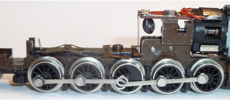I haven't mentioned the removal of the two sets of connecting rods. Here they are on a chassis which needs to be 'attended to'. Unlike the very tiny screws on the A1 and A4 locos, the devices which hold the conrol to the wheels are a simple push fit. While you are looking at the picture, note that the copper contacts for the fron two wheels are not actually touching the wheel. This may make for some erratic running over points. |