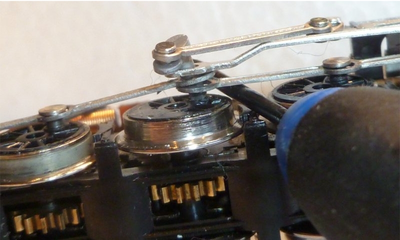 The first screwdriver can now be used to raise the two short connecting rods and the main conrod. This leaves everything in roughly the right position, but leaves a gap so that you can see the hole in the wheel. Go back to the previos photo The arm of the eccentric crank needs to point towards the balance weight) the blanked off part of the wheel where there are no spokes. The rivet st the end of the platic crank needs to be almost over the centre of the wheel. Manoevre the plastic crank with your fingers. You will be able to feel when it is resting on the sqaure hole. |