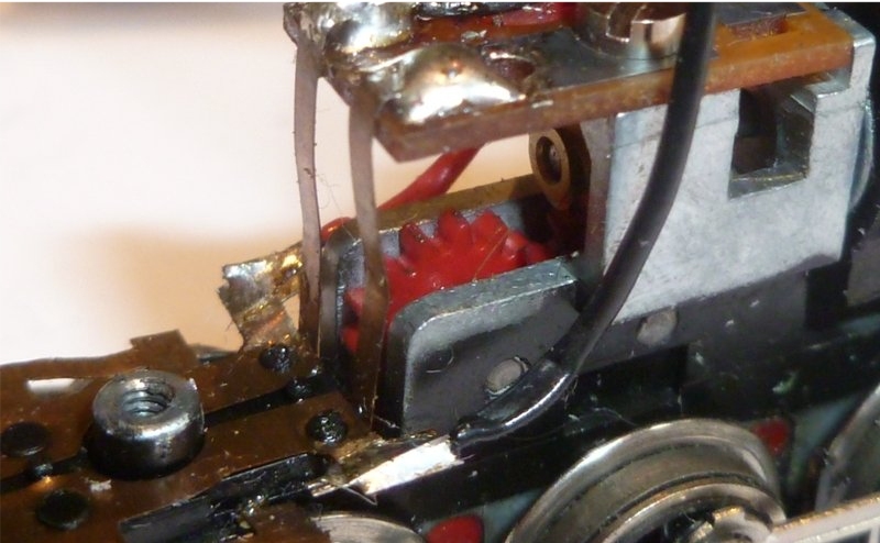 There are two tabs that stick out above the middle driving wheel. I have used these to connect the red (right) and black (left) leads to the DCC chip. |
