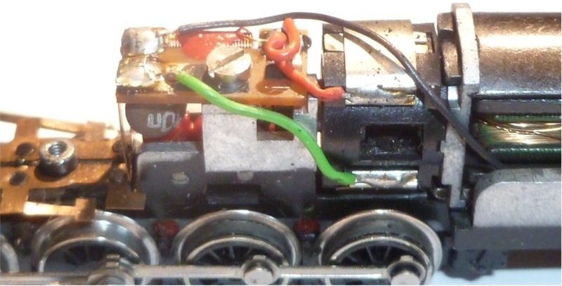 The original wiring. Carefully remove the motor brush caps slowly to prevent the spring from jumping out. Desolder the vertical copper strips from the left hand end in this photo - put a screwdriver blade behind one strip, appply heat to the blob of solder and use the blade to spring the strip away. Unscrew the screw which provides a connection between the left wheels and the chassis. Lift off the circuit board. Unsolder and remove completely the capacitor (under the board) and the choke coil. It is unlikely that these will come off easily. You wont be re-using them though. Clean up the soldered contacts and apply a new blob of solder to the front two joints where the pickup strips will be connected. Re-secure the circuit board, and re-solder the two copper pickup strips. You may need to hold the strip down as the solder cools. The black lead needs to be re-soldered to the right hand (far side in the picture) joint. Be prepared for the pickup strip to spring free ! |
