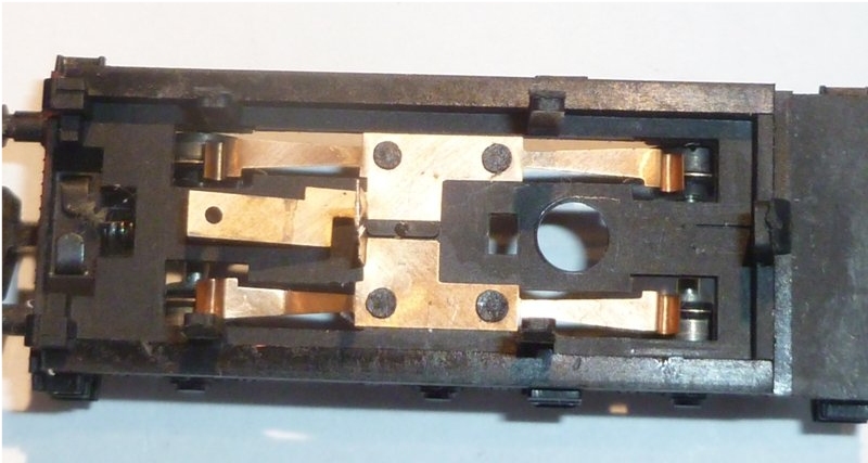9F Tender - Body and Tender Weight Removed, Viewed from Above. The connecting bar between the loco and the tender is articulated, has 3 pivot points - one at the loco, one at the tender, and the draw bar is articulated. The rear of the tender is to the left of the photo. Note the 4 contacts on the wheels at each of the four 'corners'. The tab at the rear has a hole in it, but has never been soldered. This tab should stick up slightly to press against the underside of the weight. It makes contact with the tender weight, when the weight is clipped into place. The weight provides electrical continuity to the loco through the draw-bar. The right copper strip (bottom of photo) has a soldered tab sticking straight up towards the camera. This should have the black wire attached to it, which protrudes through the hole in the metal weight. A plastic sleeve prevents any chance of this tab and wire making contact with the weight.. Note the wire emerges from the tender below the coal chute at the front of the tender. |