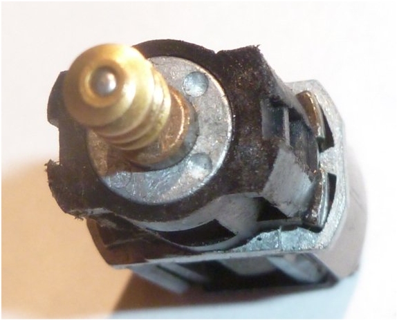 A close-up of the work end of the motor, showing the round dents in the casing. Note also the recess into which the metal caps click and lock into place. While in this state, apply a drop of thin oil to the brass bushes where the spindle leaves the casing. The motor should spin rapidly and freely (apart from the slight lumpy feeling caused by the magnets). If it feels rough, it may be that some dirt has got between the casing and the armature. You may see scratch marks on the armature. Spin the motor and blow hard into the motor windings as it spins. Do this a few times to try to clear any debris. |
