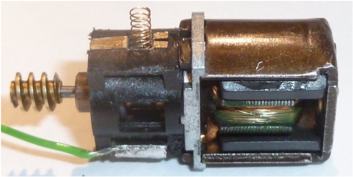 Inserting the brush housing, the brush (which is quite tiny), and the spring. The cap fits back over the top. Do one at a time to help prevent getting the top and bottom mixed up. Then do the bottom one in the same way. You now have a motor with two leads attached. It would be a shame not to test it. |