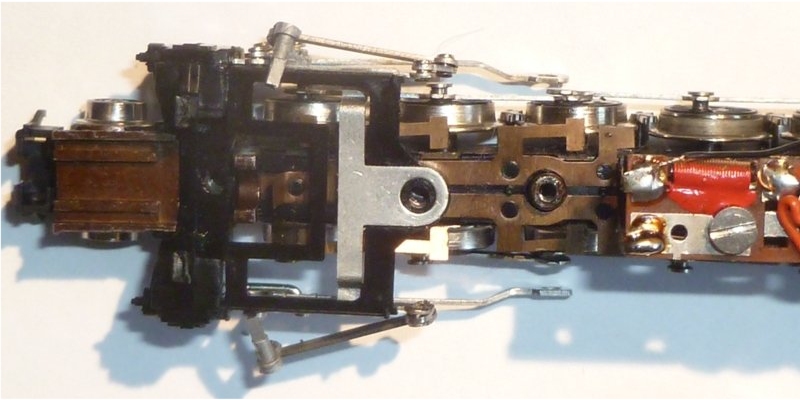 I fold the eccentric rod forward to keep it out of the way while I gently manoevre the unit from the front to rest over the locating screw hole. The conrods need to be kept in roughly the position shown, otherwise the can splay out, and start sliding back down the piston rod. |