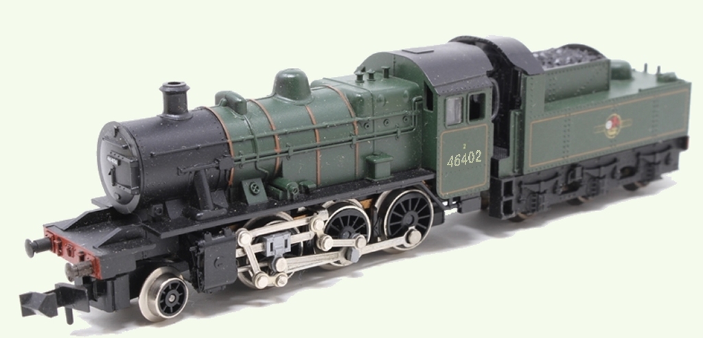 While mechanically identical to the updated ‘Britannia’, N217, ‘Boadicea’ was a brand new introduction to the range of N gauge steam locomotives. It is quite rare, having had a production run of just two years, and it sports the correct shade of Brunswick green, spoked front bogies, plastic crank pin on the centre drive wheel, and the higher gearing of the A3 and A4 Pacifics. I have found that it is not unusual for the information in catalogues to be slightly out of step with the actual models, and the numbers 51-2037-10 and 51-2037-50 have both been used for the Britannia-class locos, I think this is simply an error introduced in the catalogues. Evidence suggests that the later ‘Britannia’ was given the number 51-2037-10, and the new ‘Boadicea’ was given the number 51-2037-50 until they finally allocated the number 51-2042-00. N213 Variation - Cab Number 46402 Quietly slipping into the range of British Minitrix steam locomotives is a new Ivatt 2MT. This is identical to the earlier N213 except for the cab number, and I have no idea whether it was sold as Hornby Minitrix or just by the German Minitrix company. All I know is that I have seen photographs of this model being sold on eBay a few times. Eventually, I found a proper reference to it in the English version of the 1985/86 Minitrix Catalogue, shown under the photo of the original 46406 model, but in the caption identifying two variants, one of which places the 46402 number with the model code 51-2038-50. The actual model may have appeared later, but the only reference that I have seen is in Minitrix Catalogue sheets in 1985, so I have included it with the Britannia. I've since discovered that Pat Hammond has this model listed as 1985 as well. You have to be sharp eyed to spot this uncommon model. It is so rare that I haven't managed to locate a good quality version of it yet. The photo below is my 46406 with the number suitably modified ! This model may have been slipped into the Hornby N213 boxes rather than the 46406. I don't know. But it is quite likely that if it did, owners would not be aware that there is anything special about it !