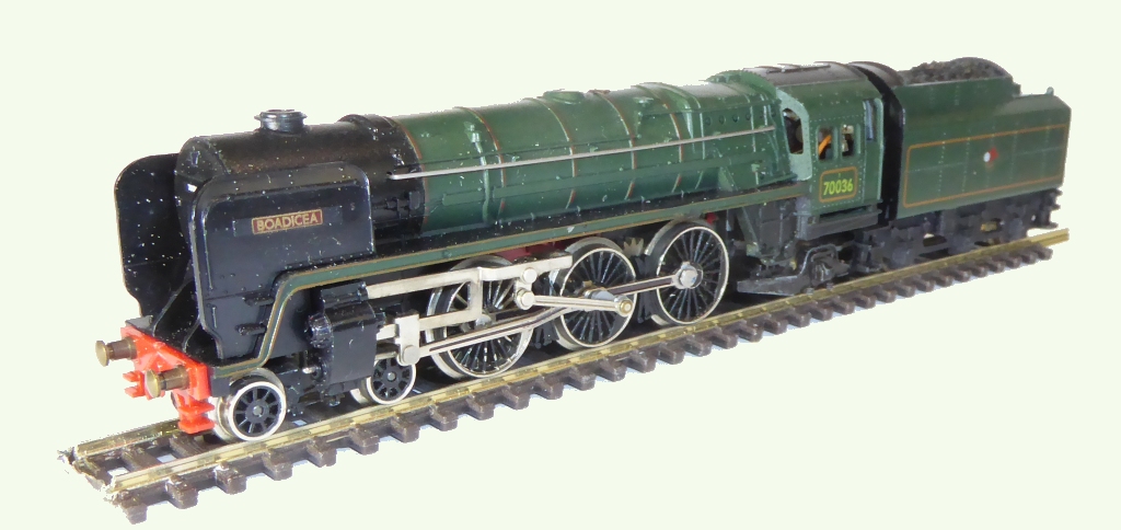 The Minitrix A4s could be prone to slipping their quartering after extended use. While it was easy to twist the wheel back into place on the axles, such wheels would often shift again. The first signs would be that the loco would develop a small ‘wobble’ as it sped on its way. Easily fixed with Loctite 603 and a couple of rectangular block back to back gauges. The chassis and the tender both have recessed areas presumably intended to house grain of wheat light bulb. There is nowhere for light to emerge from the front of the loco, but there is a small lens at the top right corner of the tender. However, bulbs and wires are not fitted to either end of the models, though there is enough space in the tender for an ECM circuit board if desired. 1985 All seemed to be quiet in 1983-1984, although the models were selling well in the shops, in spite of being much more expensive than competitiors like Lima. Go into a model shop to look for the Hornby Minitrix range, and from my own experience, they would look up information in the German Minitrix Catalogue. In the 1985/86 English edition of the German Minitrix catalogue, the British models were not shown on the pages with the continental models. Instead of the luxury of seeing five descriptions and full-size photos of model locos per page, the British and American models were all bundled together onto a single page: 10 lines each of three small photos with a small caption that provided the name and model number. However, two very welcome additions to the Hornby line-up were introduced, I assume at very little set-up cost to the manufacturers in Germany. Both were new versions of existing models. Not so easy to find nowadays, and quite rare even then. One is a renamed and renumbered version of the later Britania - Boadicea; the other is a new version of the Green Ivatt 2-6-0 & Tender. #46402 N217 Boadicea