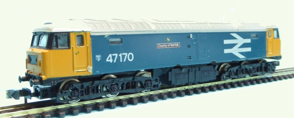 N210 - The Class 47 County of Norfolk - 51-2966-00 On the diesel front, one Minitrix model that made its first appearance in the German Trix catalogue for 1981, is N210, the Class 47 diesel-electric locomotive, number 47170, ‘County of Norfolk’ (though oddly, the image in the catalogue has the nameplate ‘Vulcan’). The German Minitrix Catalogue had a similar French outline model (CC 6500) that won a title for French ‘model of the year’ in 1980, and it appears that the Class 47 used the chassis from the French locomotive under a new body shell.