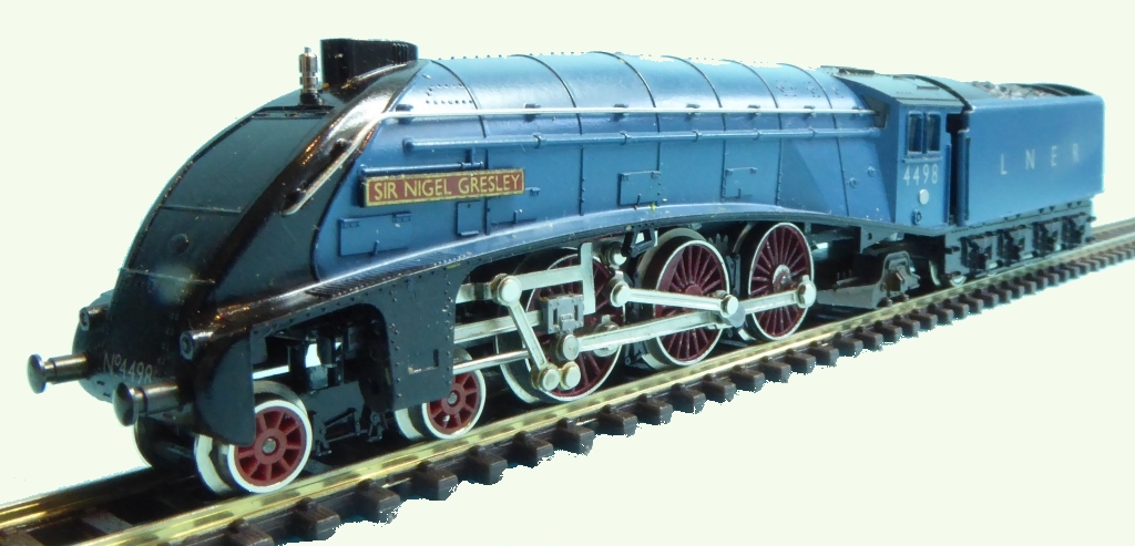 The Minitrix Class 47 'County of Norfolk' was reviewed in the NGS Journal, on page 26 of the Spring, 1983 issue. N214 Sir Nigel Gresley - A4 Class, Blue # 4498 Sometime after both the Hornby and the German Minitrix Catalogues were published in 1982, N214 ‘Sir Nigel Gresley’ in LNER garter blue came onto the scene. Coincidentally or otherwise, the real locomotive could be seen running up and down the Settle to Carlisle line on summer weekends at about this time, making its appearance as a model particularly welcome. There was very little difference between this model and the earlier ‘Mallard’ apart from the obvious red painted wheels, but it was a popular addition to the range of British steam locomotives available in N gauge, which is what Hornby were reported to have wanted to achieve with their relationship with German Minitrix.