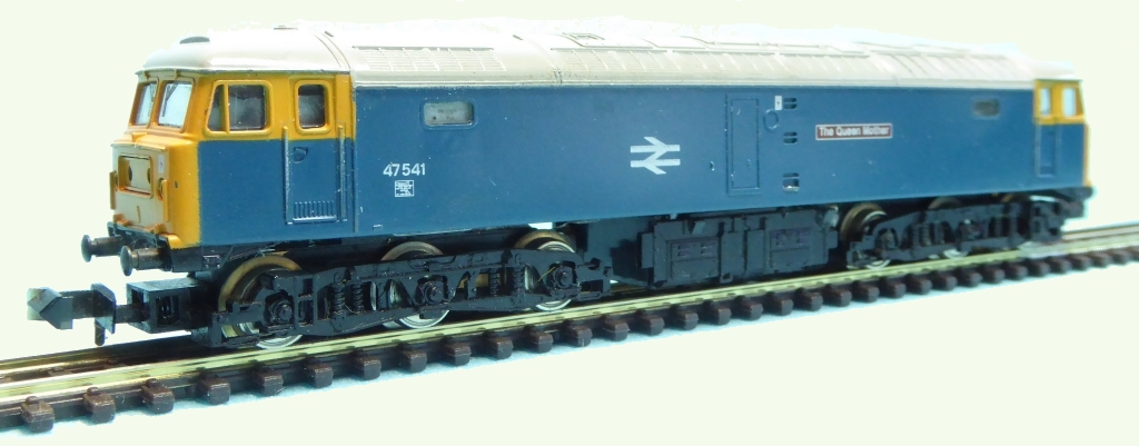 This model is attractive and well-engineered. It has four driven axles, and the chassis neatly encloses the motor without preventing air circulation, resulting in smooth, quiet operation at all speeds. There are four electrical pick-ups on each side of the loco, and the overall design and construction are a few steps up from the earlier Minitrix diesels, resulting in something that looks much closer to the real thing. The model looks in scale and is really only a tiny fraction wider than more current models, so unlike the earlier Class 27s and ‘Warship’ models, the Minitrix Class 47 doesn’t stick out like a sore thumb on a modern layout. The upper circuit board that provides the diodes for the directional lights (and supports the overhead pantographs for the French model) can even be partially sacrificed to make room in the roof for a slim DCC chip. One axle is fitted with tyres for adhesion, but its sheer weight means that it is never struggling for grip. There are some tiny retaining clips above the battery box that help to hold the body in place, and if these are not gently released first, it is possible to break away pieces of the plastic body. The previous owner of one of my models seems to have done this, resulting in a rather nibbled edge to the body, which can be sen in the above photo! On 20th October 1982, the real 47541 class 47 loco was named ‘The Queen Mother’. This was fortuitous for Hornby who quickly released their own model version - but not in time for Christmas. While broadly similar to ‘County of Norfolk’ described above, it had smaller cab numbers and a smaller double arrow logo. The model number was initially 51-2966-50, but technical data sheet of April 1987 shows the final model number 51-2958-00.