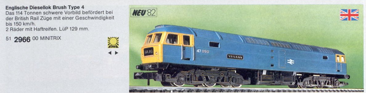The Minitrix Class 47 was first advertised as a new item in the Trix 1981-82 Catalogue.  The 51-2966-00 number is the designation for 'The County of Norfolk', but the picture shows  '47090 Vulcan'.  Clearly a change of mind between printing the catalogue and producing the finished model.  The French CC7200 was introduced as model 51-2906-00 in the same year, following on from the French CC6500 as 51-2084-00 in 1980-81.  Both of these share the same chassis and many of the same parts as the Class 47.