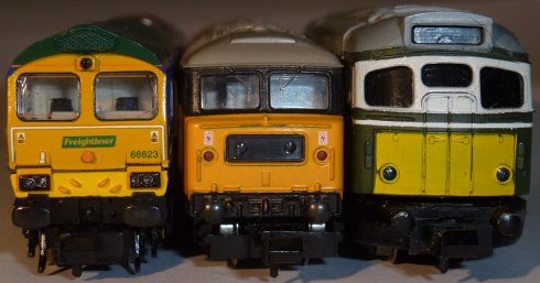 The picture shows 3 diesel locos, front view for comparison.