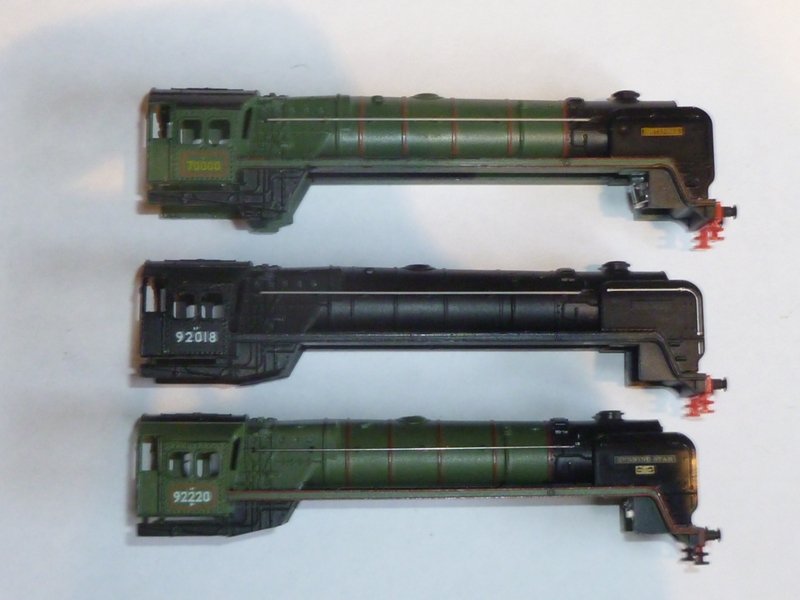 Britannia had a lower model number, so I am assuming that this was produced first. The 9Fs adapted the Britannia's body slightly by trimming a section from the pipework below, and just in front of, the cab. This is to leave room for the conrod on the rear main drive wheel. From the top - Britannia, Black 9F, Evening Star