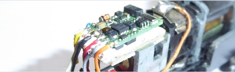Much of the logic behind the DCC conversion is covered in the DCC Conversion 1 link, so I am just going to write a summary here, with an explanation of the photos that I have taken. The tender provides a +ve pickup via the black lead from the front and rear right hand side wheels. There is also a -ve connection through the draw bar. I have never found this to be particularly reliable and with DCC I prefer to provide an extra lead for the -ve pickups from the tender to the loco. With the boiler weight removed, the tab which presses against the underside of the weight, provides an ideal solder point. Remove the circuit board - de-solder the wires which connect to it and the ends of the two long arms which rise vertically from the pickup tracks. Unscrew the board. The motor needs to be isolated from the chassis. The lower bush cap has a tag on it to connect with the chassis. Switch the two caps over so that the tab is on the top of the motor - but not until you have made the necessary soldered joints - later. There are two tabs on the pickup tracks slightly behind the middle axle. These can be used to solder a black (left) and a red (right) lead to turn to the tender in place of the existing black lead. There are two holes at the rear of the cab which will easily accommodate the wire on each side. Put a small blob of solder on the tab first. Keep contact with the soldering iron to a minimum - a second should be ample - you don't want to melt the plastic base of the pickup strip. Use adhesive pads, or double sided stick tape to fit the chip. Check the body fits on top before doing anything else. Tuck the ends of the legs under the pad. Tin the vertical connectors from the pickup tracks - about midway up their length. Plan the wiring. Solder the black and red cip leads to the vertical strip from the pickup track. Solder the orange and grey leads to the motor bush caps - when they are off the motor. The white lead for the forward light can be left long for now. |