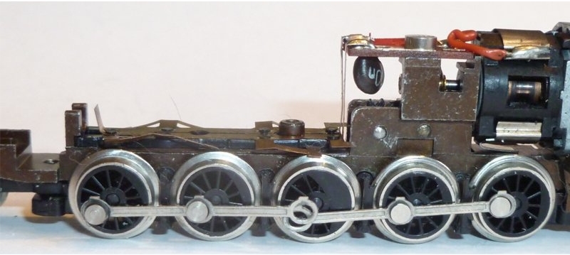 9F Chassis and Electrical Pickups A clear view of the pickups on the left hand side of the loco. Note that the contact i snot touching the front wheel of the model in this photo. This is quite common especially when tyring to straighten them. At some point the copper strip has been bent upwards, and only the centre wheel is connected to the negative (left) rail. The rear two axles do not provide electrical contact, they have traction tyres fitted, although there may be occasional earth contact with the flanges, through the axles and the chassis. |