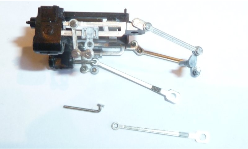 The valve gear comes complete with the pistons and plastic mouldings - unlike the Flyings Scotsman and Mallard. Here the right hand side is correctly assembled. The left hand side has the piston and conrod waiting to be reattached. Very fiddly. |